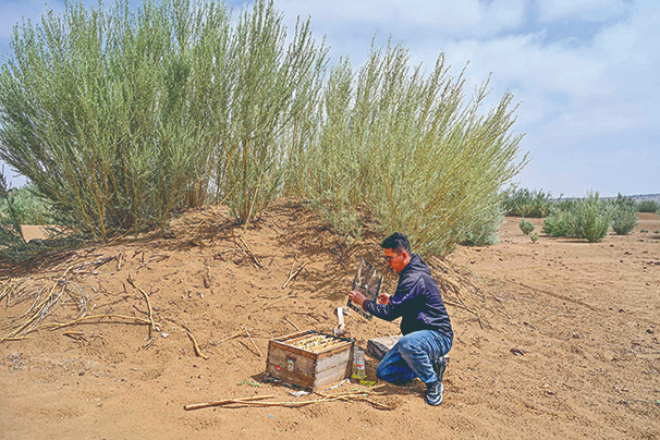 六月五日,在位于内蒙古杭锦旗的库布其沙漠,敖日格乐查看蜜蜂生长情况。