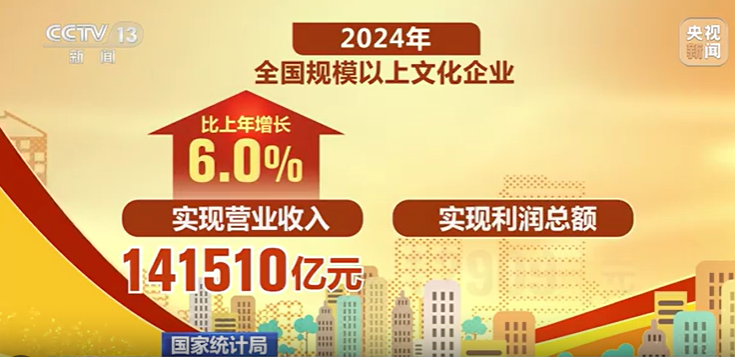 据国家统计局网站消息,据对全国7.8万家规模以上文化及相关产业企业(以下简称“文化企业”)调查,2024年,文化企业实现营业收入141510亿元,按可比口径计算,比上年增长6.0%。