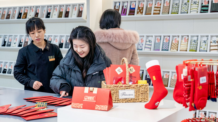 “春节期间红色棉袜的销量大幅增加。我们在设计中不断创新升级,提升产品的科技含量和技术水平,如今棉袜也成为一种兼具时尚性和实用性的商品。”杨博说。
