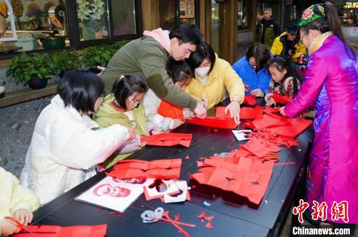 春节期间,新春市集在长廊内热闹上演,团扇拓福、书写春联,人们在互动中交换新年祝福;小年夜,这里还特别举办了一场年夜饭活动,宴请春节坚守岗位的工人,通过食物传递温暖。