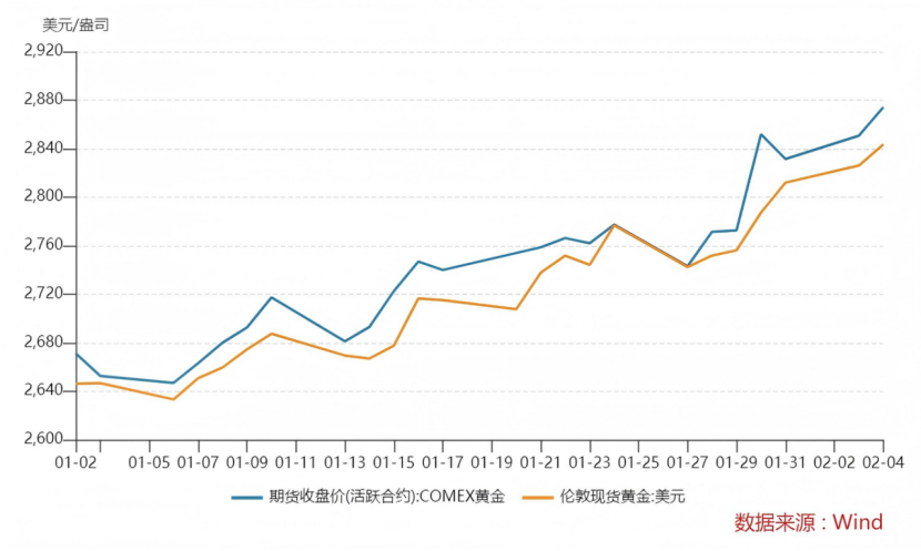 2025年以来,国际金价持续上涨。1月30日,COMEX黄金大涨近3%,创下2853.2美元/盎司的历史新高。同日,现货黄金报2793美元/盎司,上涨1.26%。1月31日,现货黄金一度涨至2817美元/盎司,续创历史新高,COMEX黄金也刷新历史新高至2862.9美元/盎司。