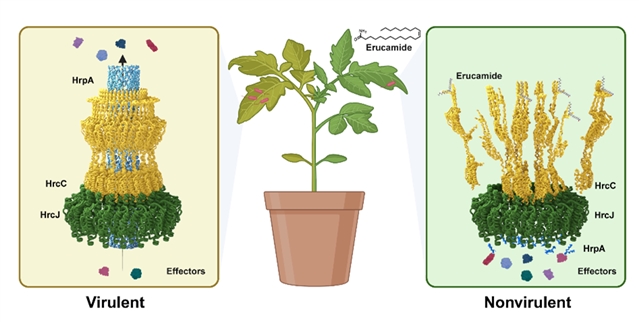雷晓光团队与合作者从名为拟南芥的植物中发现了一种独特的天然物质“芥酸酰胺”。这种物质不会直接杀死细菌,而是针对性抑制细菌致病的关键武器——三型分泌系统的毒素蛋白。它能显著减弱丁香假单胞菌、黄单胞菌等常见有害细菌的致病力。