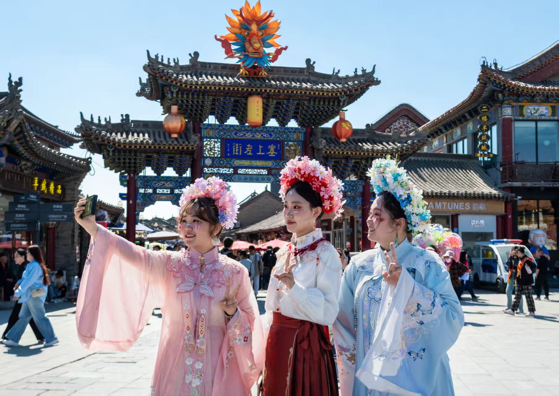 走进内蒙古各地历史文化街区,青砖红墙前尽是身着传统服饰的娇姿倩影。在呼和浩特市塞上老街历史文化街区,身着传统服饰的游客脚踩石板路,从古装剧的街景中穿梭而过,恍惚间仿佛置身于重叠的历史时空。