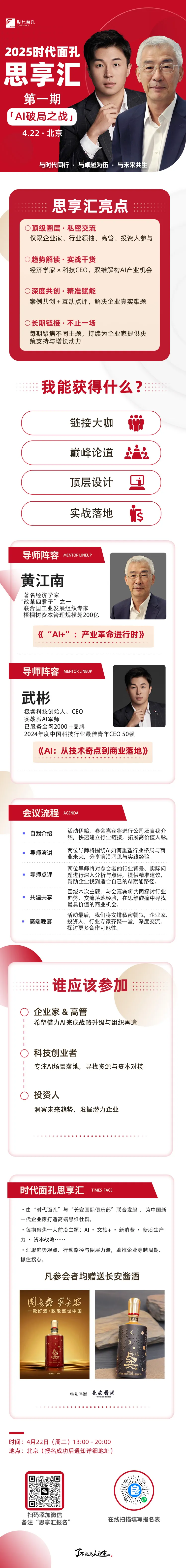 4月22日,北京 | 13:00-20:00,时代面孔×长安国际俱乐部 联合打造的「时代面孔思享汇」正式启航,企业家、投资人、科技创新者齐聚,共探「AI时代的破与立」!这不仅是一场关于AI的深度探讨,更是一场顶级商业智慧的交流碰撞。