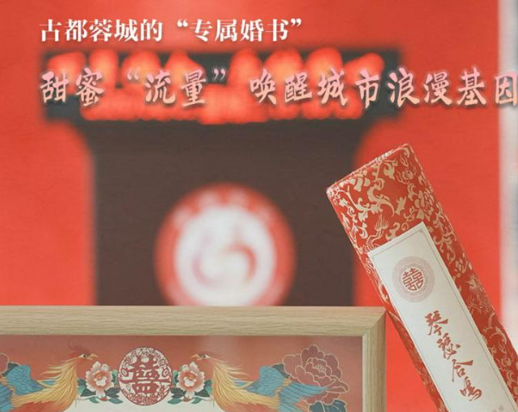 “玉垒情深、芙蓉意重,两姓联姻、良缘永结……”红纸上,凤凰于飞、芙蓉吐蕊、喜字窗花等传统纹样簇拥着婚约誓言。今年4月起,在成都各婚姻登记处领证的新人们都能收到这份市民政局赠送的定制版婚书。不少已婚人士听说后笑称“结婚早了,想补领一张”,还有新人专程从外地赶来成都“领证”。