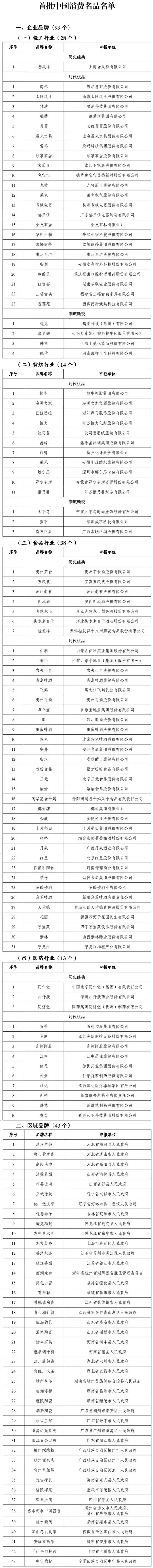 工业和信息化部近日发布首批中国消费名品名单,包括企业品牌93个、区域品牌43个,还公布了中国消费名品成长企业42家。