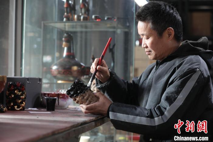 近日,在湖北荆州非物质文化遗产传承工作坊内,55岁的邹传志手持毛笔,正仔细为作品浮雕蟠蛇漆卮髹漆。卮为古代盛酒或饮水的杯子,这件作品原型为荆州楚墓出土漆器文物。邹传志介绍,后续经彩绘、描金等工序后便可完工交付。