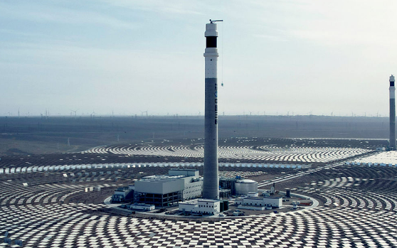 该项目现场负责人介绍,与常见的单塔单机光热电站不同,瓜州“双塔一机”光热电站采用双塔双镜场设计,在同等镜场面积下可提升约24%的聚光效率,进而提高发电能力。