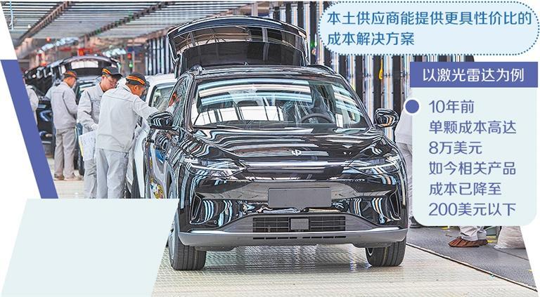 从速度上看,本土供应商对中国市场的需求和变化有着更敏锐的洞察力,能够快速响应车企的需求,加速技术研发与应用。从成本上看,本土供应商在原材料采购、人力成本等方面具有一定优势,能够提供更具性价比的汽车智能化解决方案。以激光雷达为例,10年前,单颗激光雷达的成本高达8万美元,仅能被豪华车型所搭载。随着激光雷达架构从传统的“堆料式”分立架构向芯片化集成的转变,形成大规模化应用,如今禾赛、速腾等相关产品成本已降至200美元以下。