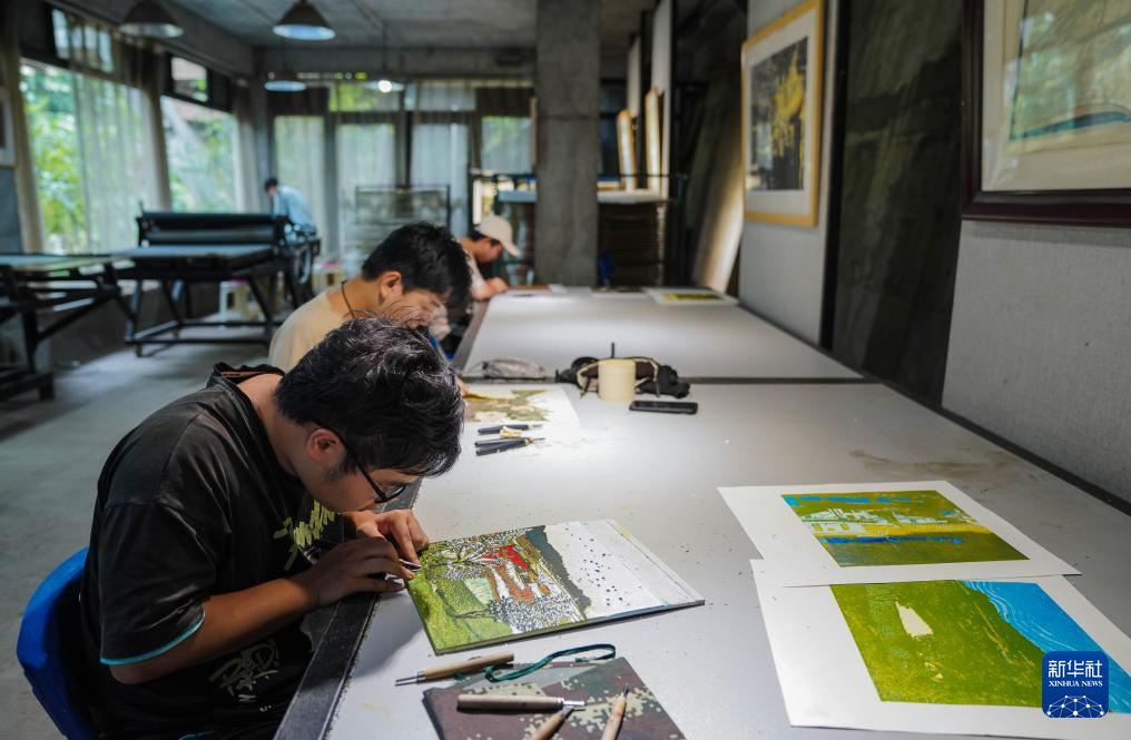 学生在云南普洱学院那柯里绝版木刻教学实践基地进行版画创作。