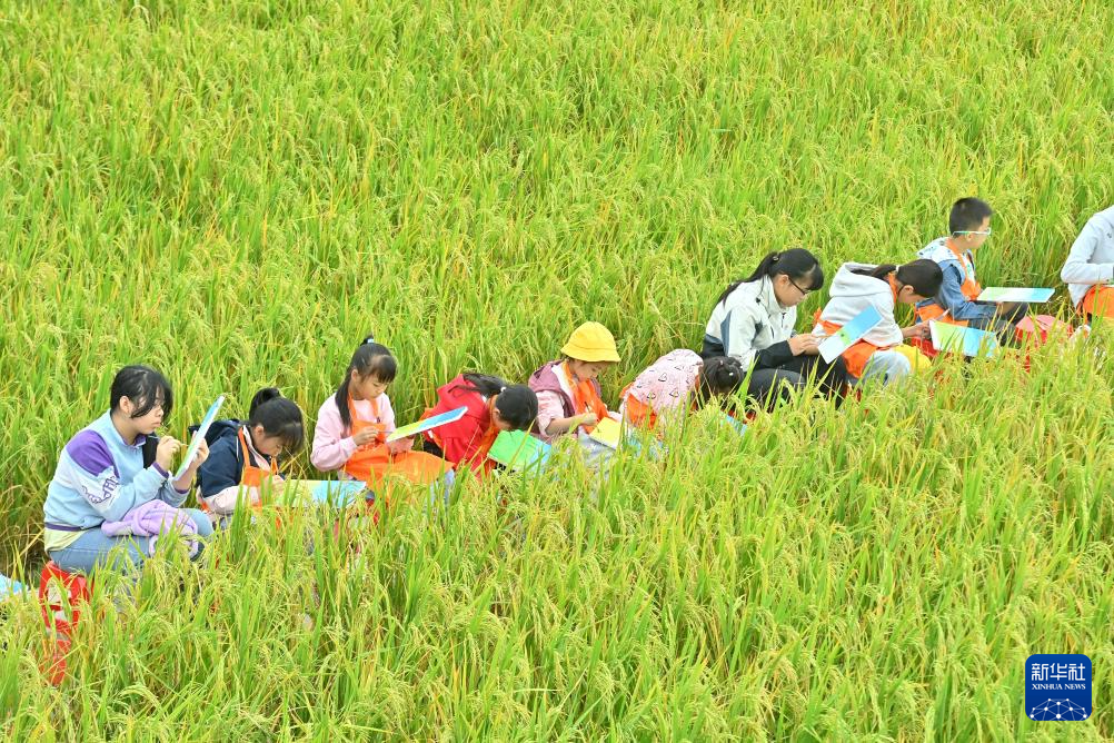 小朋友在柳州市柳江区泗浪村的田间写生。