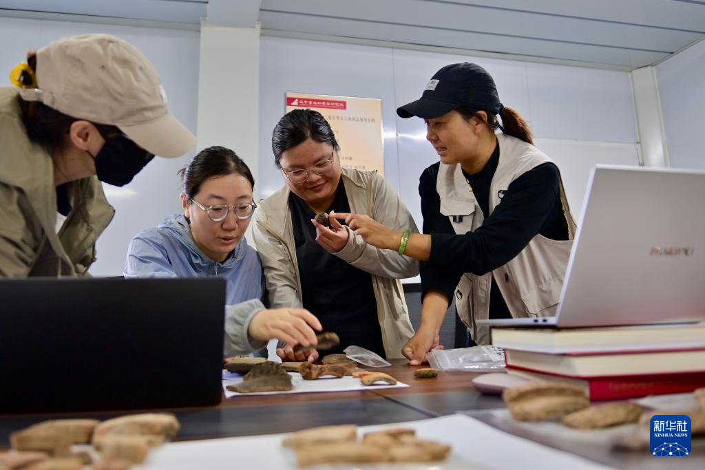 于怀石(右一)和同事在位于辽宁朝阳的牛河梁工作站内辨别出土的文物。