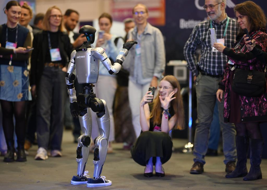 一名工作人员与一款松延动力仿生机器人互动。这款自主研发的仿生机器人采用高精密执行器,结合仿生人本体与控制算法,可实时识别并模仿互动对象的各种面部表情。
