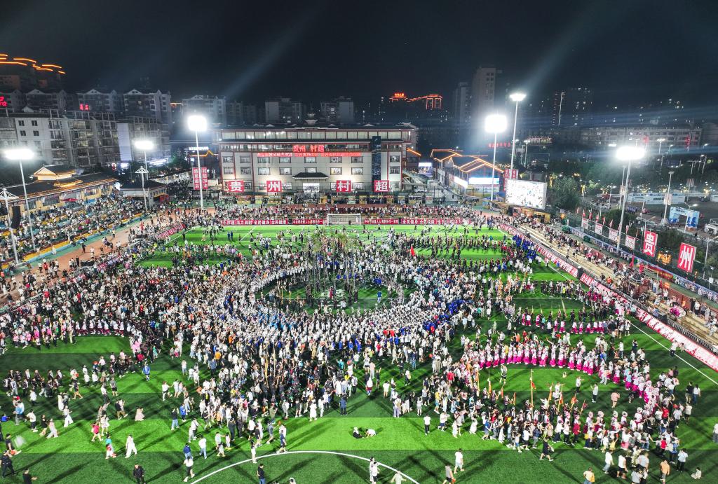 人们在贵州“村超”球场跳苗族芦笙舞(无人机照片)。