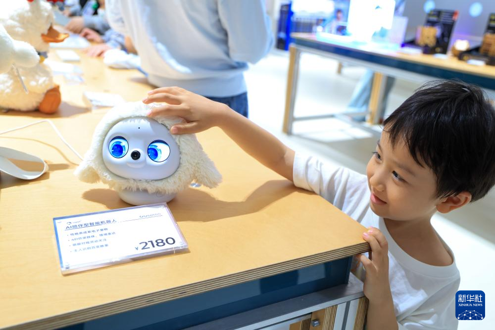 在位于深圳的全球创新旗舰店inno100,一名儿童与AI玩具Ropet互动。