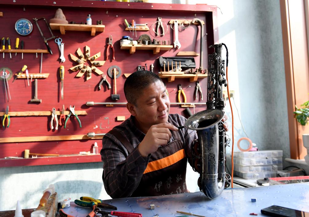 在村东头的小周工作室内,周卫仓正在组装萨克斯,他的爱人在一旁将萨克斯装箱,准备邮寄给客户。作为一名土生土长的周窝村人,周卫仓从18岁在乐器厂做学徒时与萨克斯结缘,曾前往天津、山东、日本等地学习技术,逐步成长为萨克斯制作的“头部”技师。