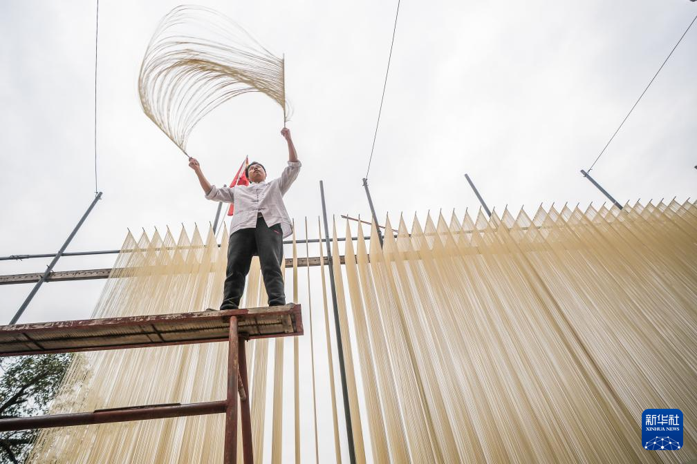连日来,四川省德阳市中江县觉慧村村民抢抓晴好天气制作手工挂面,家家户户房前屋后晾晒的挂面如银丝垂落,非遗技艺在烟火气中活态传承。